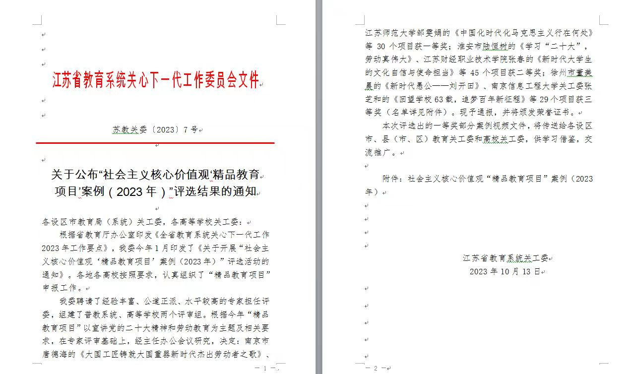 近日,由江苏省教育系统关工委组织开展的“社会主义核心价值观‘精品教育项目’案例(2023年)”评选活动落下帷幕。本次比赛共有来自普教系统和高等学校100多部作品参赛,皇冠国际 陈明选教授讲授的《延安精神的内涵与时代价值》荣获一等奖。陈明选教授的精品教育项目课程内容,立足新时代思想政治教育,以深入浅出的党性胸怀,播撒炽热而闪耀的新旧时代交际的火种,从延安时期的辉煌业绩、延安精神的内涵特征、延安精神的产生条...