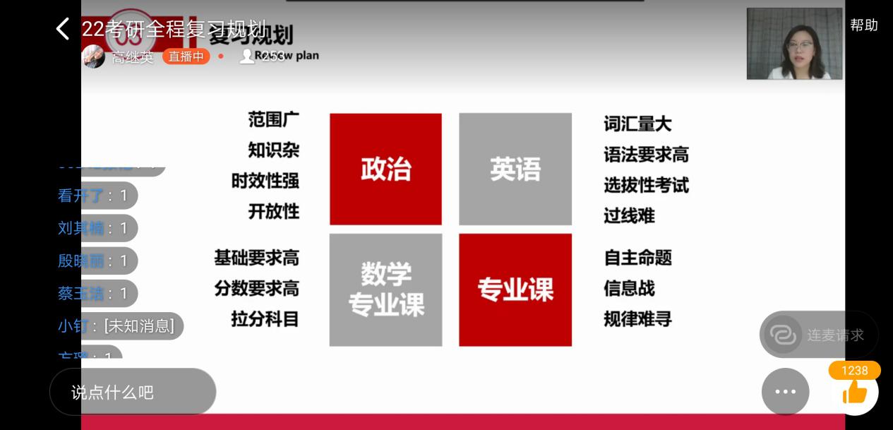 为进一步激发2022届学生的考研积极性,广泛鼓励学生把握学习机会,坚定学习目标,了解更多考研信息,9月16日晚,“致行”学习力培养辅导员工作室特邀考研规划辅导讲师高继英老师为同学们带来了一场“启航2022——考研规划直播讲座”。讲座由辅导员童玉梅老师主持,学院2022届300余名学生在年级钉钉平台上观看了这场直播讲座。考研直播课内容主要分为四大部分,分别是考研形势、时间规划、复习规划和目标规划。直播伊始,高老师...