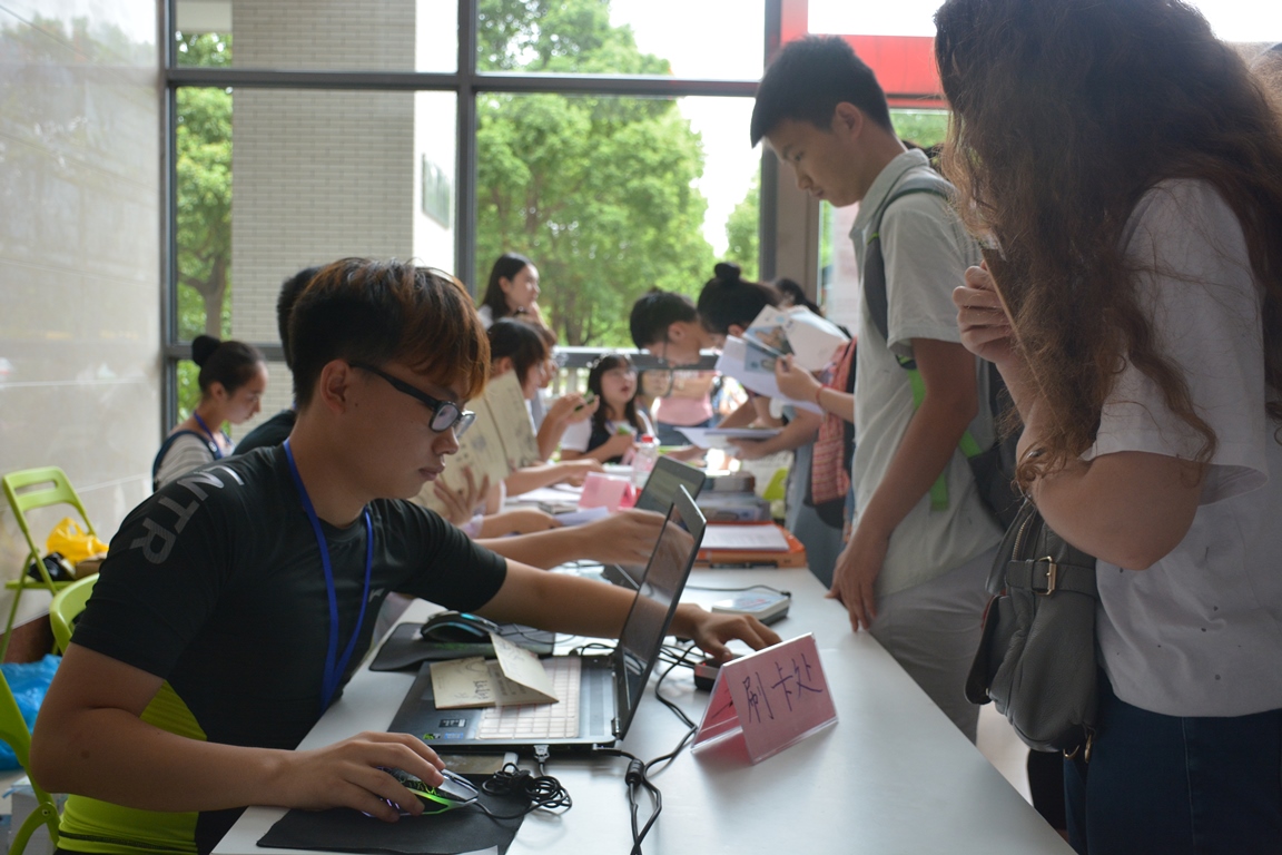 设在学院北门厅的新生报到处为不同专业设立了单独窗口,方便同学们快速找到自己的负责人,完成报到。在报到处后方,学院特意设立了签名墙,来自五湖四海的新同学们可以在上面留下自己的名字,合影纪念来到江南大学,来到皇冠国际