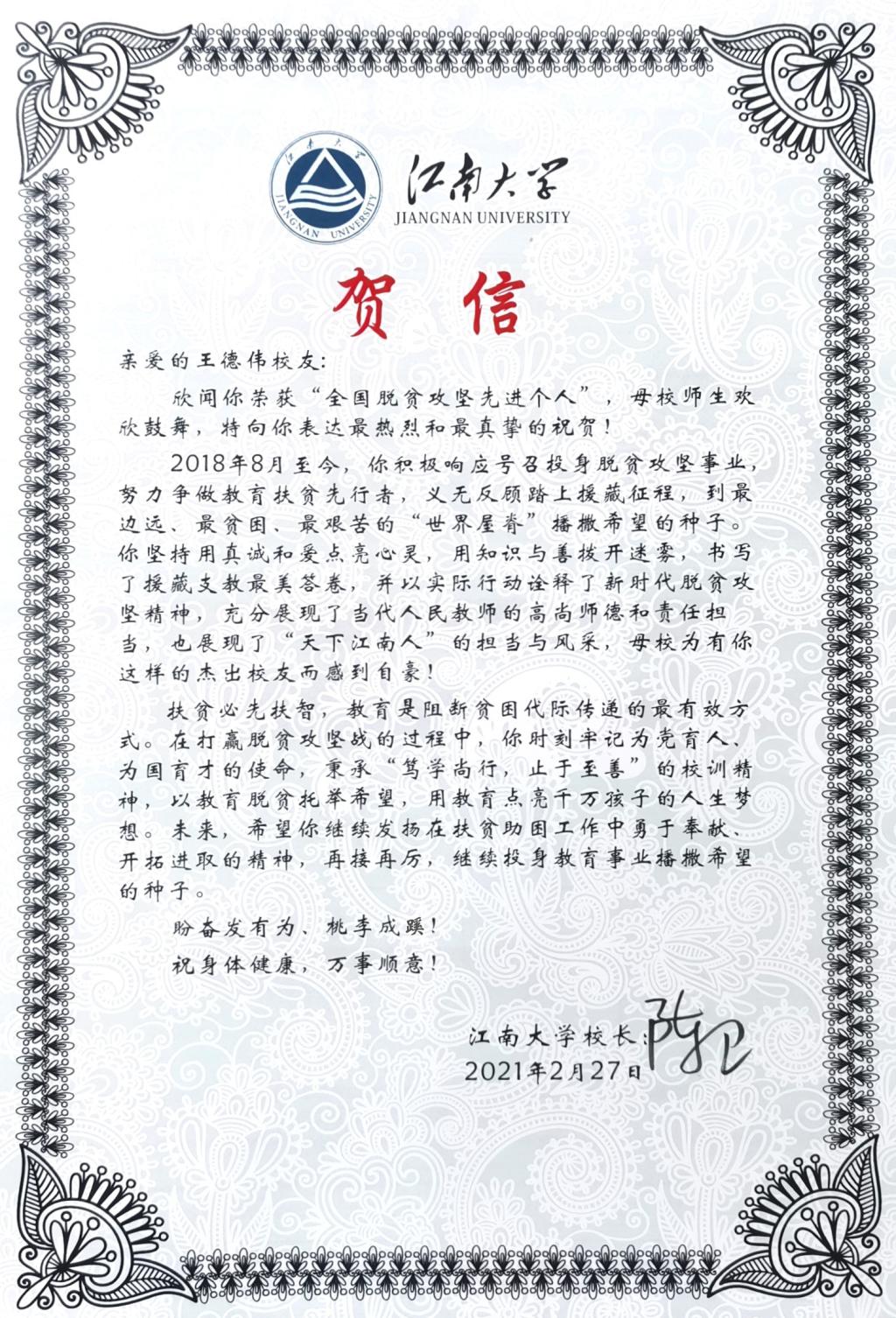 近日,江南大学校长陈卫向刚刚获得“全国脱贫攻坚先进个人”的皇冠国际 小学教育专业2015届校友王德伟发来贺信,代表学校向王德伟表达最热烈和最真挚的祝贺。贺信表示,在打赢脱贫攻坚战的过程中,王德伟时刻牢记为党育人、为国育才的使命,秉承“笃学尚行,止于至善”的校训精神,坚持用真诚和爱点亮心灵,用知识与善拨开迷雾,书写了援藏支教最美答卷,以实际行动诠释了新时代脱贫攻坚精神,充分展现了当代人民教师的高尚师德...