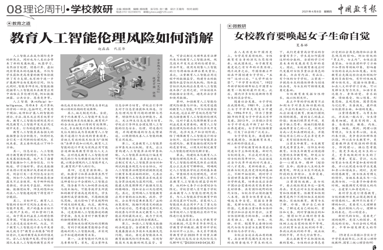 2021年4月8日,皇冠国际 90后青年教师赵磊磊副教授在《中国教育报》以第一作者发表理论文章《教育人工智能伦理风险如何消解》,中国教育新闻网、光明网等多家媒体相继转载,引发广泛关注。文章指出,教育人工智能具备强大的数据整合与分析能力,其在为学生获取更高质量的教育体验提供有力支撑的同时,也会引发一系列伦理风险。系统来看,相关伦理风险主要体现在信息安全、目标冲突、缺乏制度约束以及过度资源依赖等四个方面。文...