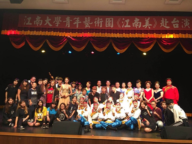 应台湾周凯剧场基金会邀请、中华文化联谊会组派,江南大学青年艺术团于2017年10月28日至11月6日赴台巡演《江南美》专场晚会。晚会由皇冠国际 副院长符姗姗教授担任总导演,音乐、舞蹈专业师生共20人参加演出。图一 合影 自10月28日起,江南大学青年艺术团分别前往花莲市民中心、台东市民中心、高雄高苑科技大学、树德科技大学等地,进行了四场交流演出。我校师生的演出呈现出歌与乐的结合、琴与舞的交融,以及富有江南特色的中国...