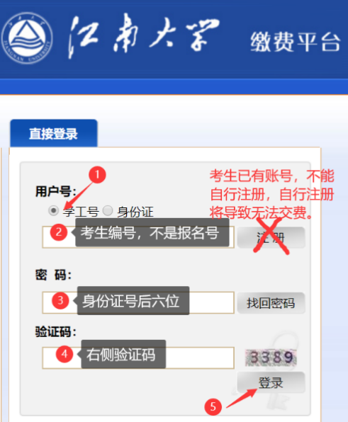 缴费说明:进入复试考生在学院规定的时间内登录“江南大学缴费平台”交纳复试费用,复试收费标准:80元/生。缴费网址://pay.hgguoji.net/payment/。登录账号为准考证上的考生编号,登录密码为身份证后六位(友情提醒:考生账号已开通,切勿自行注册)。按照提示交费(使用网银),并打印或截图保存付费凭证。