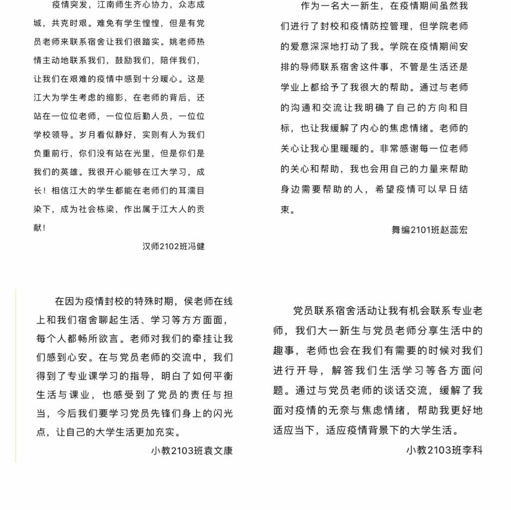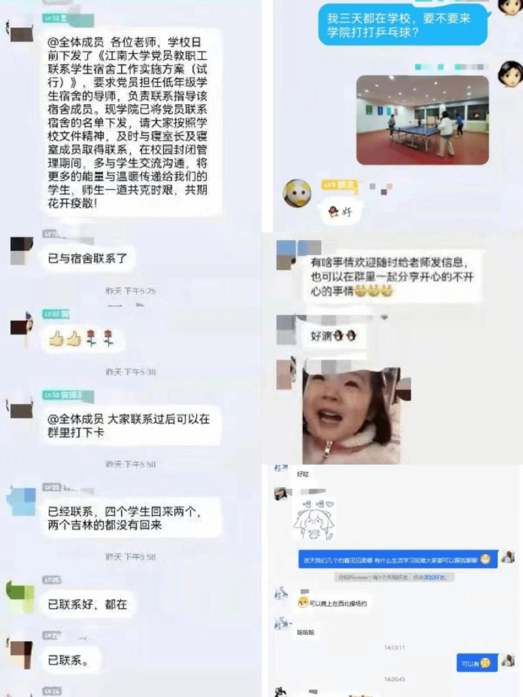 3月底,学院在明确工作要求和联系清单的基础上,并分别面向教职工党员和学生做了线上动员和部署,各教职工党支部、党员迅速响应,落实联系对接学生及宿舍。在疫情防控升级的特殊时期,教职工党员通过微信群、QQ群、企业微信群组与学生联系对接,关心学生学习生活状态。目前教职工党员已与宿舍及同学建立了联系,部分党员已通过多种形式与同学们开展活动,在学业、生涯规划、心理疏导、校园生活等方面给予指导与关怀,拉近师生关系。其中,党委书记姚剑英老师在进校值班期间走访联系宿舍,听取同学们对学院工作的意见和建议,王冰冰老师与同学们约好在疫情稳定后一起聚餐,张慧老师与同学们约定一起跑步健身……学生们也纷纷表示在与老师们的交流过程中感受到了来自学校、学院、老师的温暖与关爱。