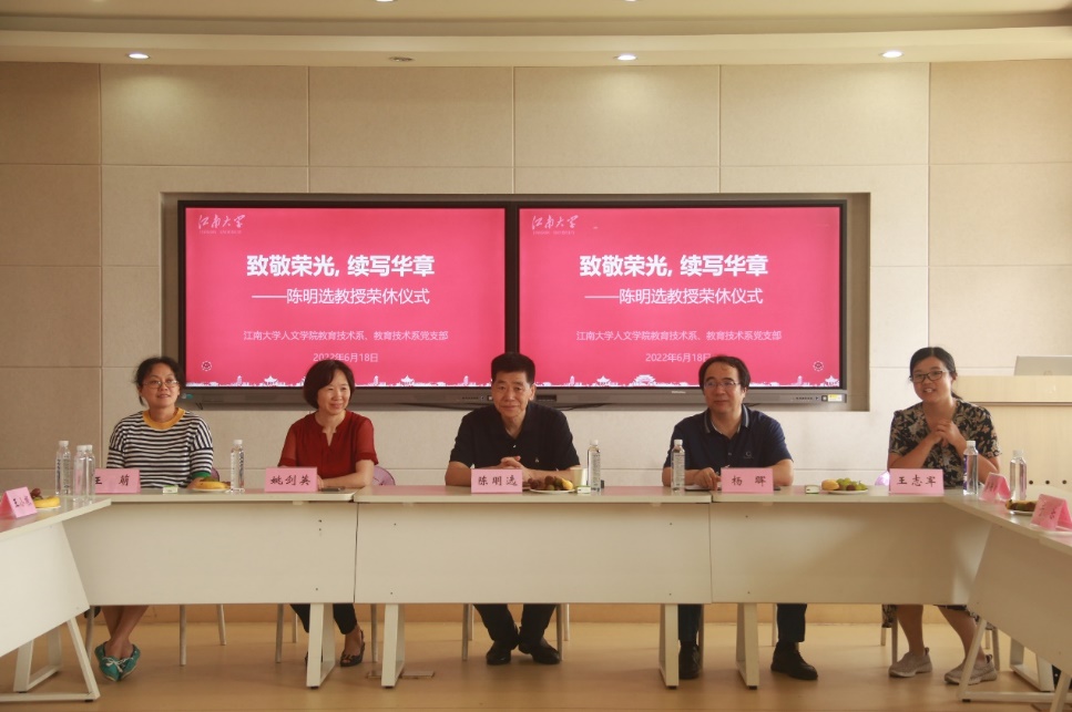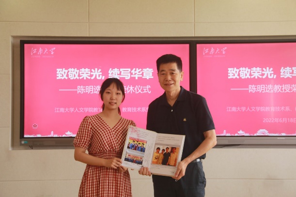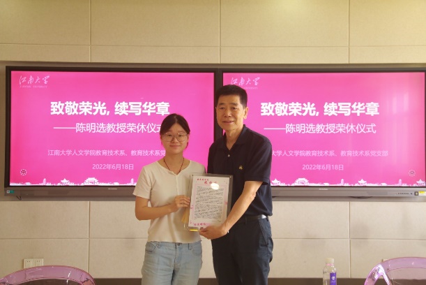 砥砺前行、艰苦奋斗的精神,请陈明选教授将珍贵的故事和经验记述并留传下来,为学院与学科发展再添一份力量。支部组织委员牟智佳谈起陈明选教授对我们的影响可以用“一师一者”来概括,一师是指他是我们年轻老师的人生导师,关注我们的专业发展和成长;一者是指他是健康生活的行动者,这种良好的行为习惯激励着我们年轻老师,既要工作好,也要锻炼好身体。舒杭作为一名新入职的年轻教师,同时也是教技支部的发展对象,表示这场温馨隆重的荣休仪式,是一种荣誉、一种肯定,对自己而言,则是一种发扬、一种传承,要学习老一辈党员无私奉献的精神,以实际行动为专业发展添砖加瓦。