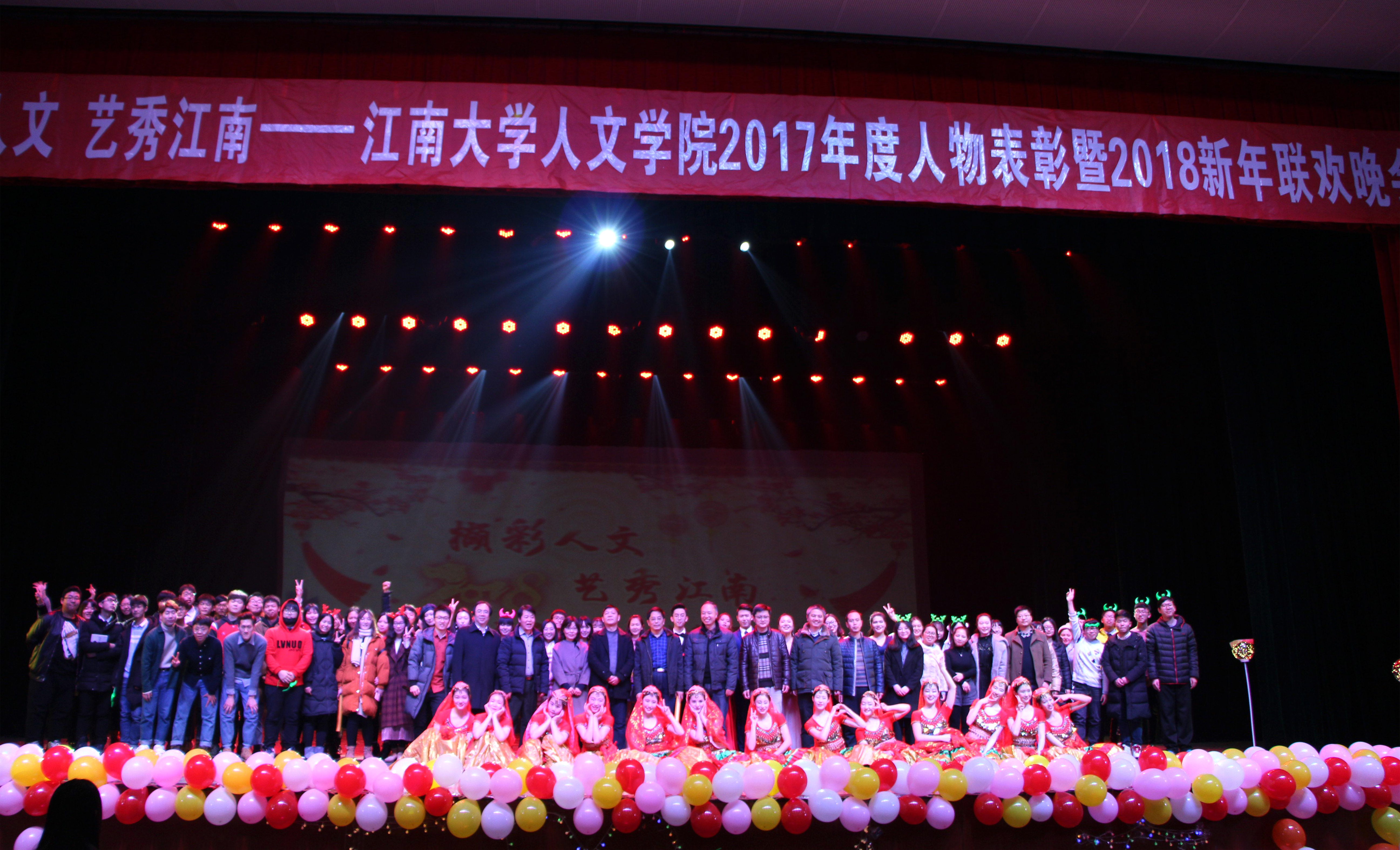 2017年度人物表彰暨2018新年联欢晚会在文浩馆隆重举行。江南大学人事处处长徐锡清、社科处处长刘焕明、研究生院副院长武美萍、宣传部副部长张海峰、党办副主任秦永和、学工处副处长汪双喜,皇冠国际