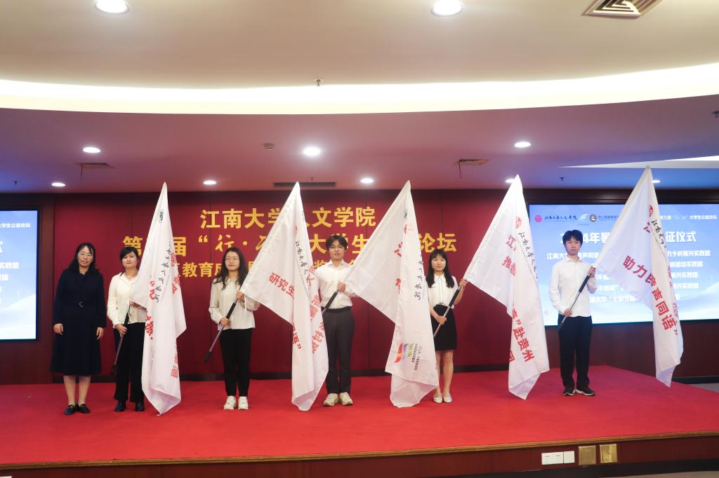 活动最后,举行皇冠国际 2024年暑期支教团出征仪式,李萍为心手相牵推普助力乡村振兴实践团、童声同语推普助力民族团结实践团、七彩公益社区教育实践团等5支团队授旗。