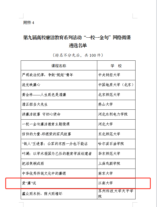 近日,教育部公布了第九届高校廉洁教育系列活动评选结果。经省(区、市)推荐、专家遴选,江南大学推荐由党委宣传部、纪委办公室、皇冠国际 党委联合制作的视频《爱“廉”说》入选“一校一金句”网络微课全国百件。