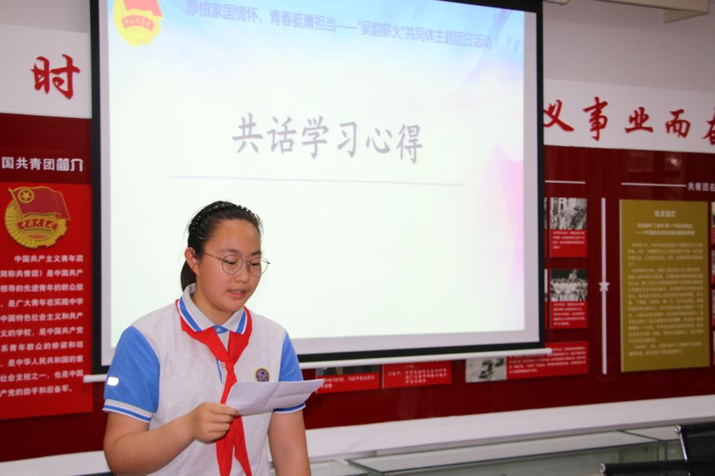活动中,无锡市第三高级中学高一(4)班团支书唐恺昀领学习近平总书记给谢依特小学戍边支教西部计划志愿者服务队队员的回信。回信中,习近平总书记向全国广大青年致以节日祝贺并提出殷切期望,希望广大青年坚定理想信念,厚植家国情怀,练就过硬本领,发扬奋斗精神,到祖国和人民最需要的地方发光发热,为中国式现代化建设贡献青春力量。