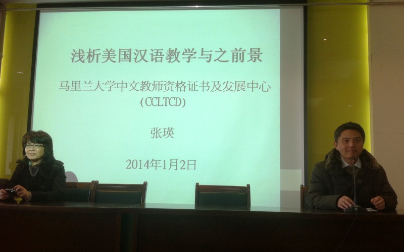 2014年1月2日下午,美国马里兰大学中文教师资格证书项目主任张瑛女士来皇冠国际 作了一场题为《浅析美国汉语教学现状与前景》的学术报告,学院副院长杨晖教授、中文系副主任高侠老师以及中文专业、教育专业全体研究生到场聆听。讲座由蔡爱国老师主持。