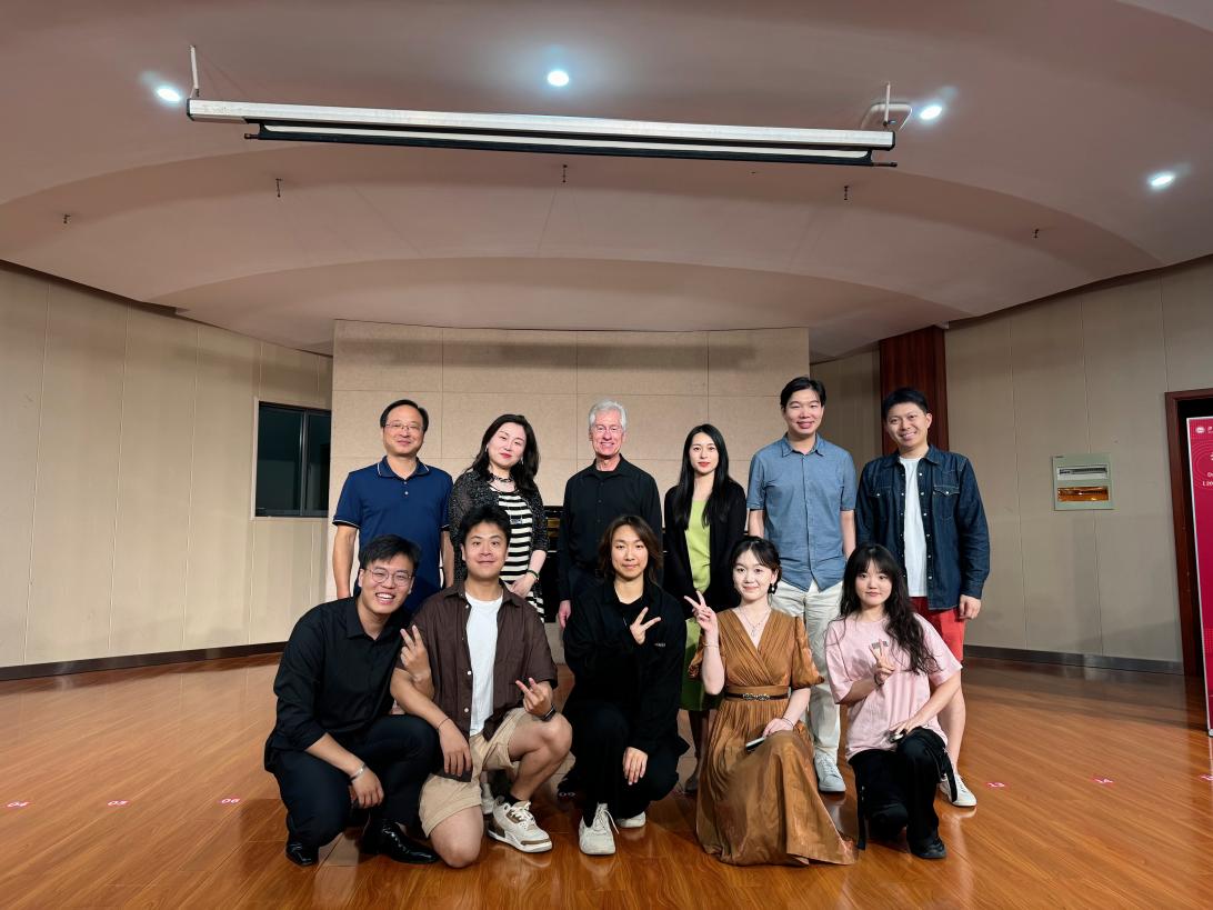 在教学互动环节,Robert Wells教授为音乐系四位学生进行了个性化歌曲指导。首位学生演唱了歌剧《唐璜》中的咏叹调《夫人请看这张名单》。Dr.Robert Wells强调,在演唱意大利歌曲时,元音的连贯性至关重要,建议学生在演唱前充分吸气,保持声带的持续打开状态,并确保声音位置的稳定性。紧接着第二位学生演绎了歌剧《艺术家的生涯》中的咏叹调《漫步街上》。Dr.Robert Wells指导学生在演唱时避免用力挤压声带,而是应放松身体,让气息自然吸满并保持流动。他推荐通过高抬腿边走边唱的方式来帮助身体放松,同时在走动中利用背部肌肉为歌唱提供支持。第三位学生呈现了歌剧《塞尔维亚理发师》罗西娜的咏叹调《美妙的歌声随风飘荡》。Dr.Robert Wells建议通过转动胯部等身体活动来训练演唱时的核心稳定性,同时保持声带的放松和元音的连贯,确保气息带动声音持续向前,以维持音乐的流畅性。最后一位学生演绎了歌剧《费朵拉》洛里斯的咏叹调《被阻止的爱》。Dr.Robert Wells首先对学生的声音和歌唱能力给予了肯定,并建议在演绎时避免过度用力,推荐使用气泡音和打嘟噜等技巧来辅助演唱,以轻松减少喉部的压力并放松声带。在讲座问答环节,参会学生就声带保养、气息训练及快板的演唱技巧等具体问题与Robert Wells教授进行了热烈交流,师生们纷纷表示受益匪浅。