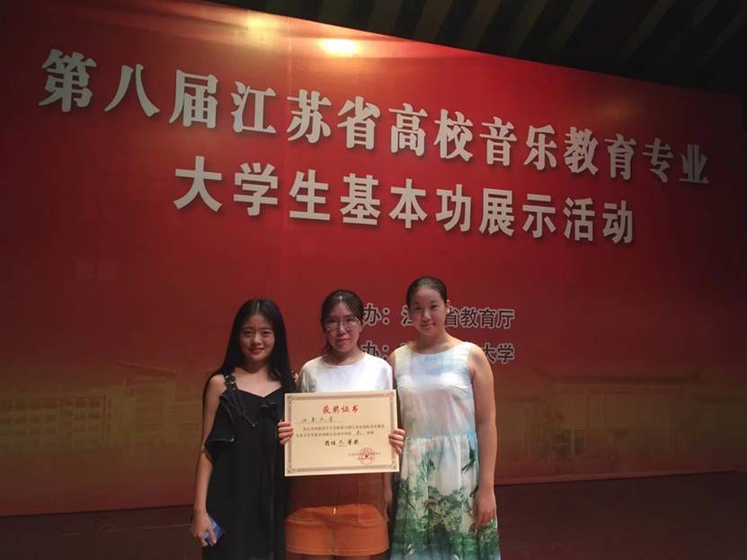 音乐学(师范)专业15级学生进行随机抽选,最终由曹靖雯、夏婉莹、许晶晶三位同学代表江南大学参加此次活动,并荣获省团体三等奖(排名第一)的可喜成绩。