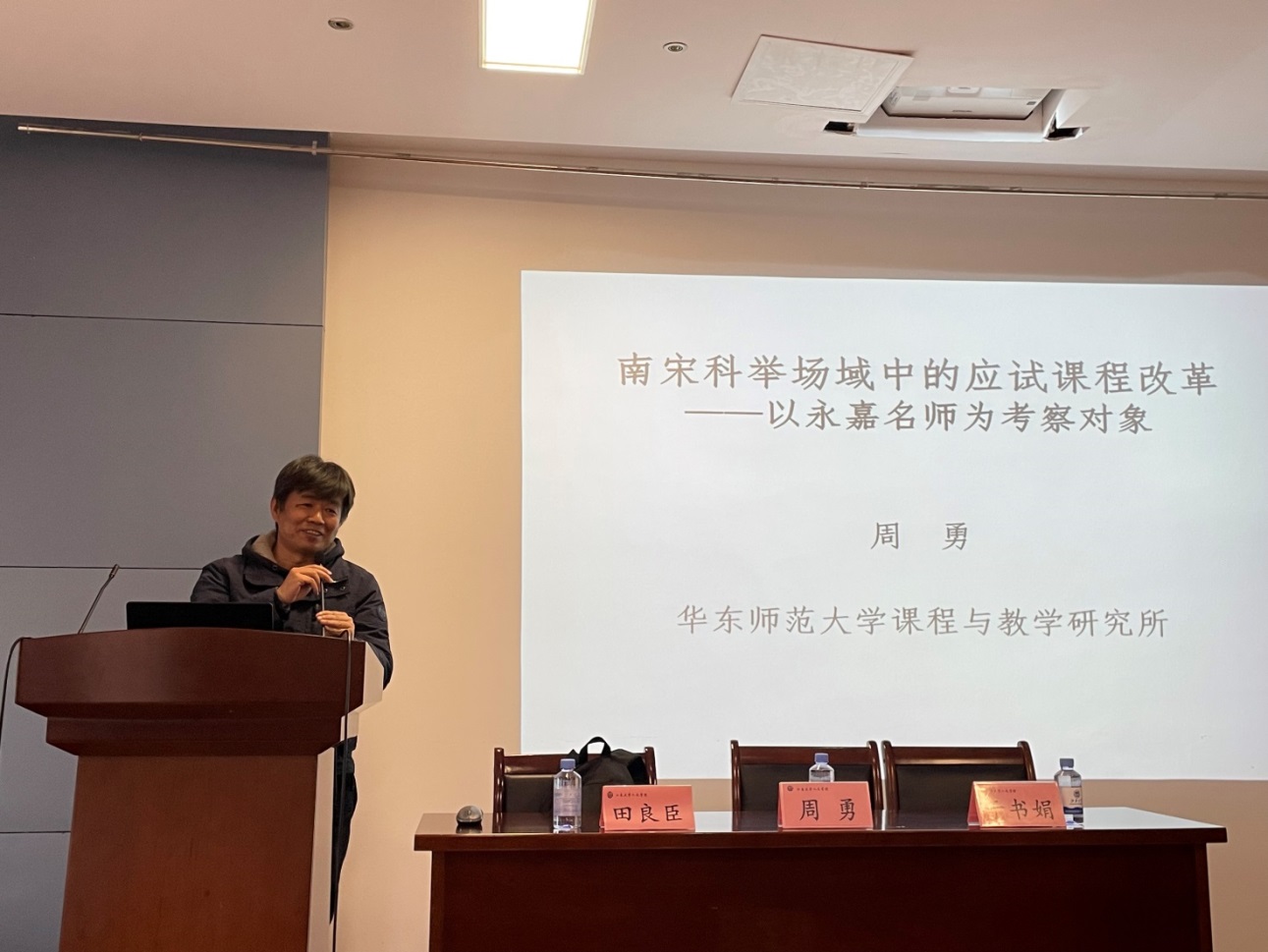 周勇教授以《南宋科举场域中的应试课程改革——以永嘉名师为考察对象》为题,从学术研究动态与教育现实关照讲起,探讨了永嘉名师及其在科举场域中的地位,具体从动机与宗旨着眼,分析了以陈傅良与叶适为代表的永嘉名师们的应试课程改革行动,并尝试提出应试课程改革的永嘉模式与永嘉课程学派及其改革路径。最后,周教授还结合当下的课程理论发展与改革实践,提出了基于中国课程史研究构建本土课程论的可能。