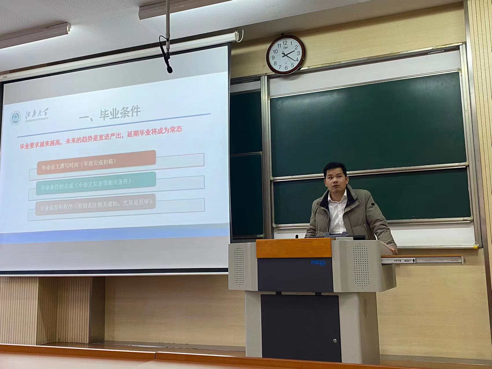 随后,邵祥岚讲解了研究生综测方案修订,提醒研究生关注自身和他人的心理健康,介绍了学院研究生的就业情况并给予了切实的指导。田贤鹏老师针对研究生教育宽进严出的趋势以及毕业要求逐年升高的现状,从毕业条件、中期考核、实践要求和学术道德四方面对大家提出了要求和建议,帮助同学们反思学习方式的转变,成为合格的研究生。