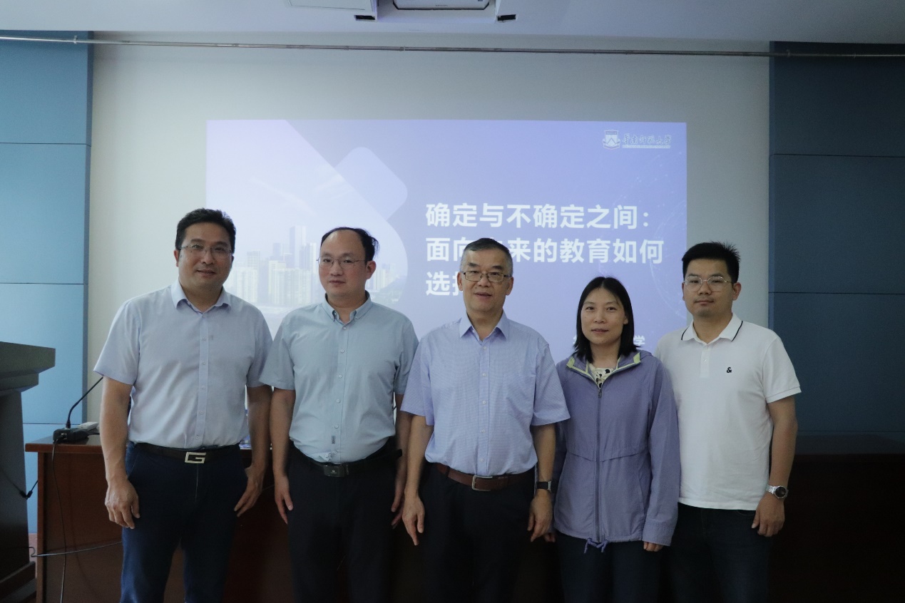 讲座伊始,卢晓中以“教育要如何面向未来”作为导言,详细讲解了智能时代教育培养新人的两个向度:适应性培养与引领性培养,学校应注重彰显学生的引领性品格,从容应对未来的不可预见性。随后,卢晓中提出培养学生思维既要有扎实的知识作为思维发展的基础,又要兼顾创造性思维与批判性思维的培养。教育应实现从适应型教育到超前型教育再到创新型教育的未来转型,并以技术内在赋能教育,实现“订制化”的教育。最后,面对人工智能时代对教育造成的冲击,卢晓中指出教育要从综合思维能力与融会贯通能力、创造性思维、人文因素三个方面结合,使人类智慧超越机器智能以面对未来社会的变化。