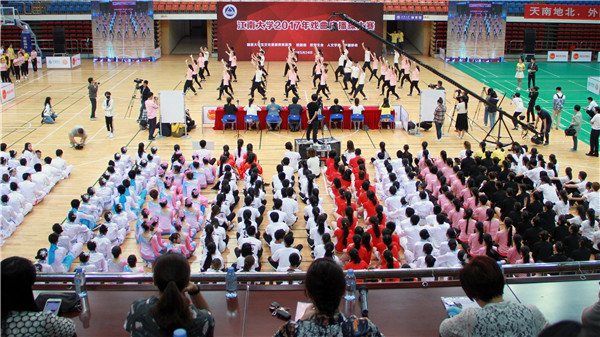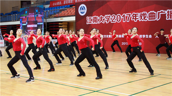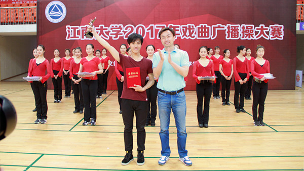 副院长符姗姗老师宣读比赛规则。比赛正式开始后,一支支整齐有序的参赛队伍身着各色服饰陆续登场,展现出的不再是大众印象中戏曲的“唱、念、坐、打”,也不仅是体操动作的“横平竖直”,而是在体操运动的基础上,把戏曲身段动作中的“腕花小云手”、“飞天十三响”、“拉山膀”、“亮相”、“涮腰”等融入整套动作,两者结合相得益彰,浑然天成。一招一式,收放自如,时而流畅有力,时而婉约柔美,配合着恰到好处的节律,用肢体动作这种无声的语言,使得情动于中而发于外。相近的舞蹈内容,在不同学院的精心演绎下展现别样的精彩风貌,通过动作改编和队伍排列展现别具的匠心。“自由运动”里,大家发挥想象力,自由展示,动作效果虽不能与行家相媲美,却也将迂回婉转的东方美和自成一派的潇洒体现得淋漓尽致,充分展现了江大学子蓬勃的青春与朝气。