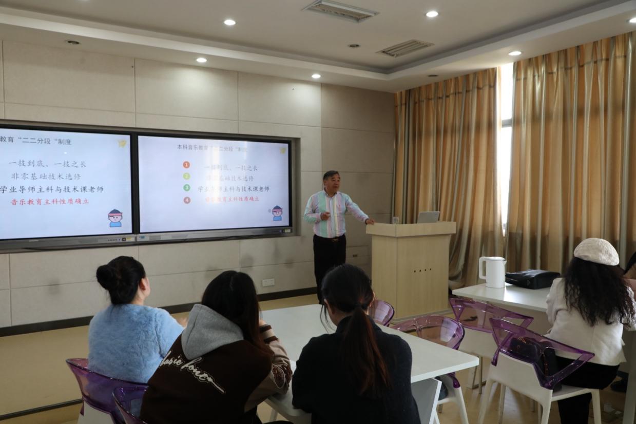 徐元勇教授在讲座中指出,随着社会和教育的不断发展变革,音乐教育领域导师课程需要持续更新和调整以适应时代需求及学生成长。他提到当前音乐专业类院校与综合师范大学在音乐学科设置上存在差异,并强调本科阶段“二二分段”制度、设立主科与技术课老师作为学业导师对于培养学生综合素养和工作能力至关重要。徐教授还分享了自身多年来在音乐教育领域的研究经验,鼓励在场的师生们积极思考并探讨该领域未来发展方向,不断提升个人的学术水平和教学质量。
