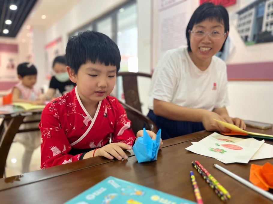 在“指尖上的玫瑰”环节,参与活动的家长和小朋友一起在志愿者们的带领下折纸玫瑰,指尖翩飞下,一朵朵纸玫瑰绽放在每个人的手上。小朋友们将自己折好的玫瑰花高高举起,送给自己的父母以及老师,并勇敢表达自己的爱意。