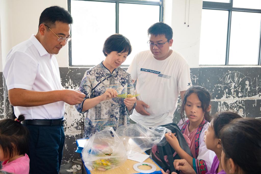 党委书记姚剑英一行走进课堂教学现场,向同学们赠送书包等学习用品,与大学生志愿者们深入互动,与孩子们亲切交谈。
