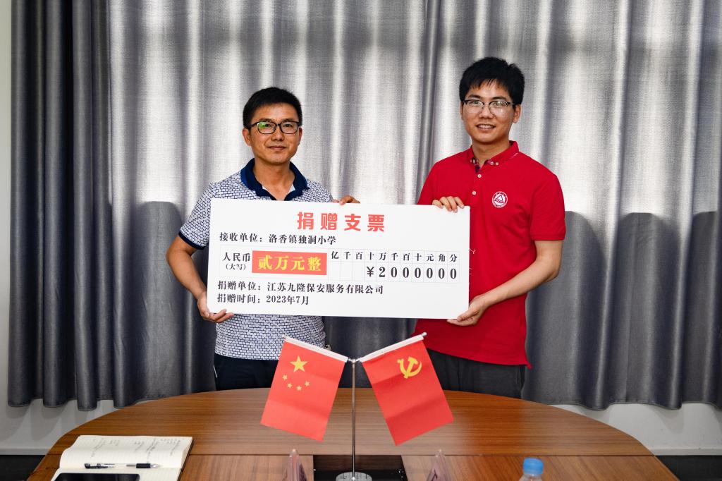 长期以来的帮扶以及江苏九隆保安服务有限公司的爱心捐赠表示衷心的感谢。他表示自江南大学定点帮扶独洞以来,独洞小学在基础设施等方面有了明显改观,学生们的上课条件有了明显改善,此次江苏九隆保安服务有限公司的爱心捐赠更是为独洞小学解决了不少实际困难,希望未来各方能进一步加强合作,助力独洞小学持续发展。