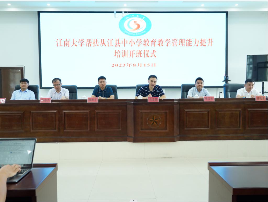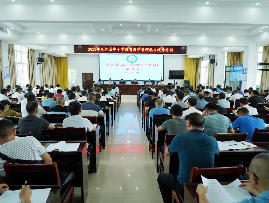 在帮扶从江教育振兴与发展方面作出的贡献,表示此次培训的活动与内容安排充分体现了江南大学教育学科的长处与从江县教育事业的短处有效契合,在推进从江教育振兴、提质跃升方面具有重要意义。并对参训的校长提出要求,强调作为一线学校的管理者须主动作为、主动服务、主动担当,积极落实学习成果转化。钱吴永同志向专家团队介绍了从江县的基本情况,指出区域经济的高质量发展重点还是在于教育的高质量发展,教育的短板已经成为制约从江整体发展的掣肘。他强调,面对新时代的人力资源开发、产业转型、文化传承诉求,必须要以高质量发展为靶向统筹全局,正视自身教育现状和问题,牢记初心使命。他希望参训学员借助此次培训强化理论学习,积极思考减量提质的最佳方法和途径,为从江县教育发展贡献力量。马志强教授向与会领导和参训学员们介绍了江南大学、江南大学教育学科的基本情况,讲述了开办此次培训班的背景、目的、意义,解读了本次培训方案的模块设计与内容结构。他希望参训学员们能够扎根民族文化,深度思考自身面临的问题,在此次培训活动中与专家们双向奔赴,共同研讨,谋得良计。