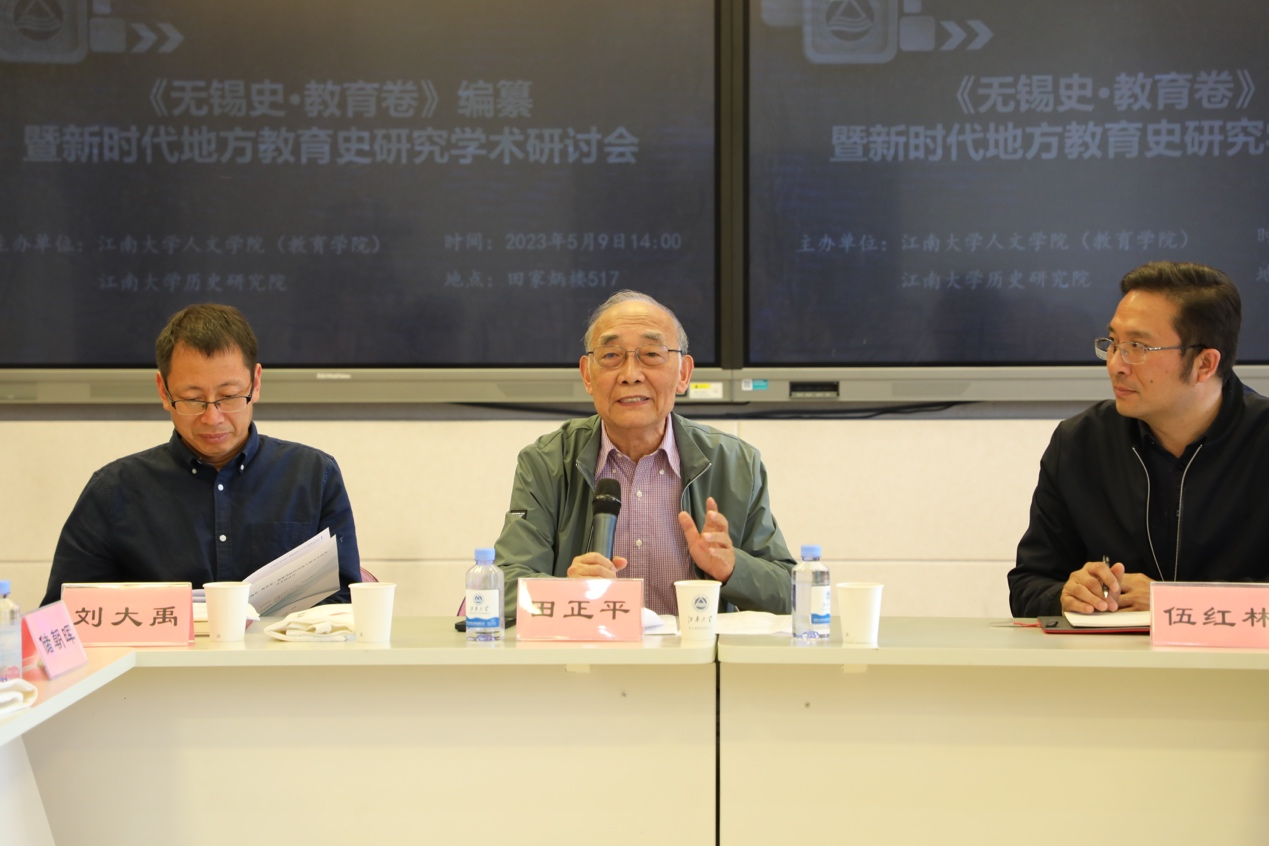 田正平做研讨会总结发言,对《无锡史•教育卷》的编写给予了肯定,认为编写团队思路清晰,符合历史研究的基本逻辑,并强调在实际编写中要开阔眼界,跳出教育看教育,综合考虑教育发展与城市发展、教育与无锡工商业的关系、强调教育与文脉传承的关系,在全面呈现无锡教育全貌的同时,通过抓住典型人物、机构、事件,凸显无锡教育的个性。