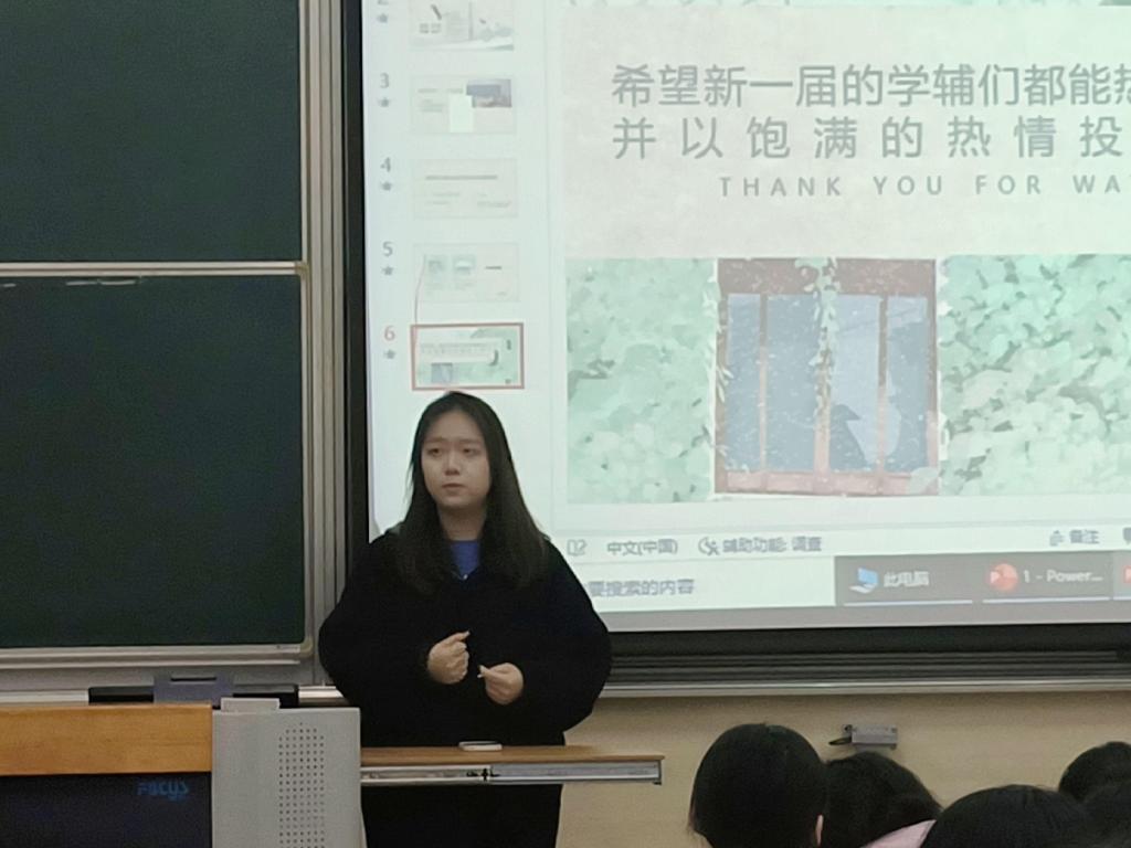 本科生学业辅导员管理办法》,并对细则进行了说明。经验分享环节,李陈媛和张圆缘两位同学对新一届学业辅导员与大家交流了自己做学业辅导员的体验和收获。其中,李陈媛同学指出“热爱,热情,真诚,奉献”是学业辅导员的应当具备的品格和态度,张圆缘同学则侧重分享了她做学业辅导员时的辅导方式和技巧。谢铅玉老师从学业辅导员的多重身份出发,强调了学业辅导员对于学院学风建设的重要性,并指出学业辅导员要有责任心和服务奉献精神,不仅要给同学们提供学业辅导,更要发挥榜样引领作用,践行“知行合一,以人育人”的院训精神。
