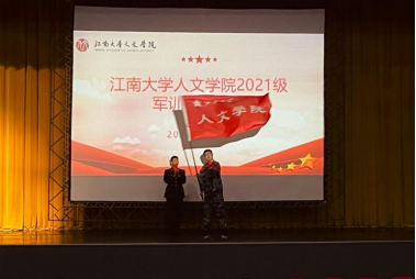 2021级军训连授旗,在铿将有力的摇旗下,刘璇刚老师以自我为表率号召同学们积极投身到此次军训当中。