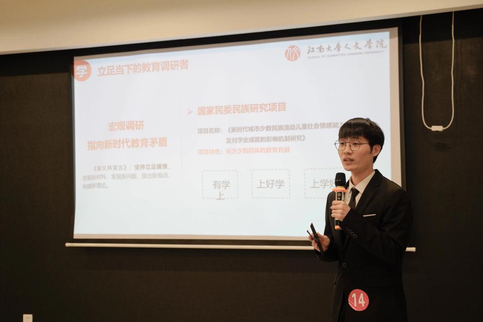 邵剑耀同学以《行稳致远·进而有为》为题进行风采展示。他围绕其硕士阶段主要扮演的三大角色即“立足当下的教育调研者”“满怀理想的学术研究者”和“肩负责任的服务践行者”展开此次答辩。他围绕《新文科宣言》《中国教育现代化2035》等政策文件,叙述了自己在国家级项目参与、省市级调研、立足江大服务于本校人才培养过程中的经历;他围绕学术发表、学术汇报、学术获奖三个维度叙述了自己的科研成果,从调查再回到理论,用“事实”述说“教育故事”;他在担任皇冠国际