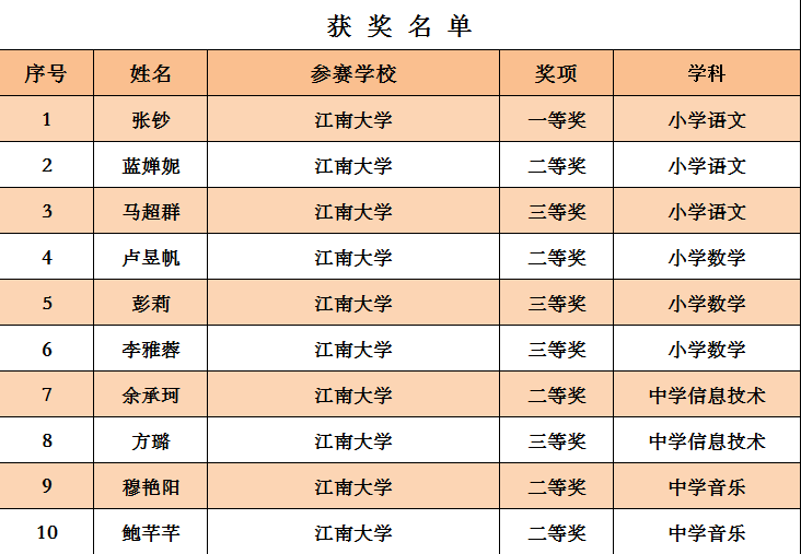 近日,第十届江苏省师范生教学基本功大赛成绩揭晓,经过激烈的比拼,人文学子在参加的小学语文、小学数学、中学信息技术、中学音乐四个学科组别的比赛中,共获得10项奖项。其中一等奖1项,二等奖5项,三等奖4项。
