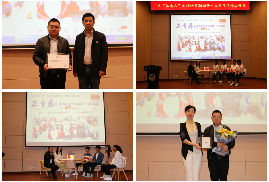 分享结束后,江南大学社会资源处副处长窦新华为王德伟颁发“天下江南人大讲坛”纪念牌并赠送“天下江南人”徽章,青年代表送上鲜花。
