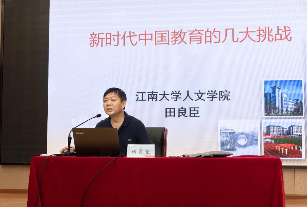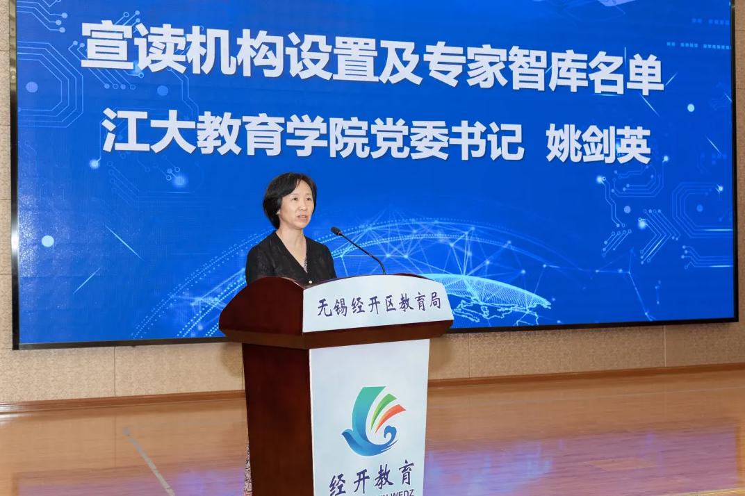杨柳在致辞中表示,经开区作为太湖科创带上的枢纽之城,智能制造已成为区域战略发展方向,人工智能教育也将成为经开教育高质量发展的突破口。随后,田良臣与杨柳分别代表教育学院和经开区教育局为研究院成立揭牌,姚剑英宣读了研究院机构设置与专家智库名单。最后,杨柳代表经开教育局为首席专家陈明选颁发聘书。整个揭牌仪式都由智能机器人克鲁泽主持。揭牌仪式结束后,田良臣为经开区中小学校校长和骨干教师作了题为《人工智能时代的教育挑战与应对》的专题讲座。