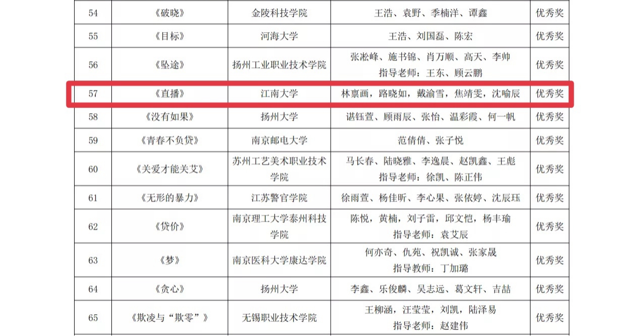 学子路晓如、沈喻辰、戴渝雪、林禀画、焦靖雯五位同学所报送作品《直播》荣获优秀奖。