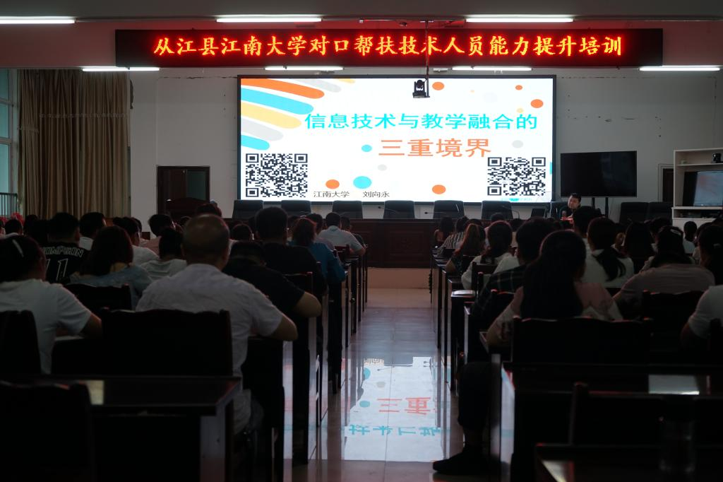教育系徐兆洋副教授、教育技术系刘向永副教授分别为全体学员作了专题培训,拉开了从江扶贫培训项目序幕。从江县江南大学定点帮扶专班成员及从江县各乡镇150余名小学教师参加了培训。
