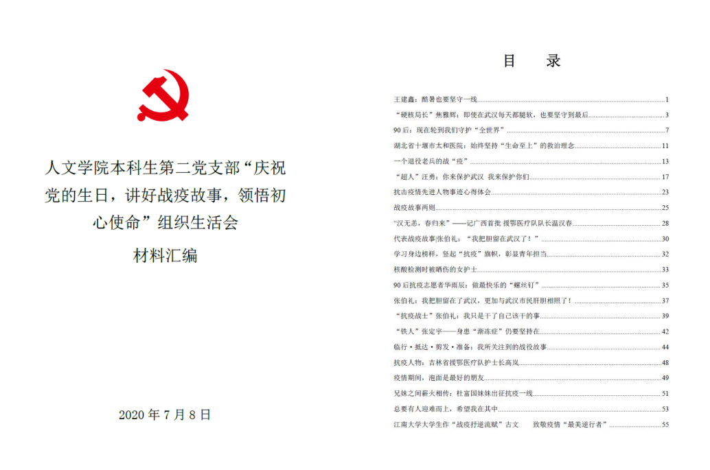 本科生第二党支部组织全体党员及部分入党积极分子开展了线上战疫故事分享会暨“庆祝党的生日,讲好战疫故事,领悟初心使命”专题组织生活会。党员们讲述身边的战疫先进模范事迹,分享切身体会,向战疫期间的所有逆行者致敬。