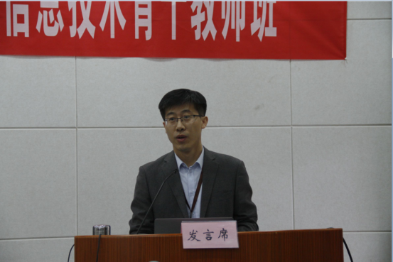 陈明选教授对课程方案进行了深度解读,本次培训的主题是面向新版课标的高中信息技术教学设计与实施,培训旨在深化高中信息技术教师在职业理解与学生发展方面的认识,强化信息化条件下的道德规范,提高师德践行能力;深度理解新版高中信息技术课程标准的内涵,把握信息技术课程前沿发展动态,根据学校和地区实际情况开发、设计具有特色的高中信息技术必修课程和选修课程;把握信息技术课程的教学特征,能够根据不同类型的课型进行教学设计,提高高中信息技术教学设计、教学实施、教学评价等能力;能够诊断分析高中信息技术教师教学问题,进行培训需求分析,能够设计培训方案,掌握适合高中信息技术学科培训的各种有效培训教学的方式方法。最后陈教授希望学员们珍惜机会,提高对培训的认识,真正做到学有所成,明确自身责任,深切感悟“国培”价值,积极互动反思,踊跃投身教育实践中。来自山东邹平县第一中学郭凤广作为学员代表发言,他号召全体学员珍惜研修机会,努力学习,勤于反思,为本次培训交上一份满意的答卷。