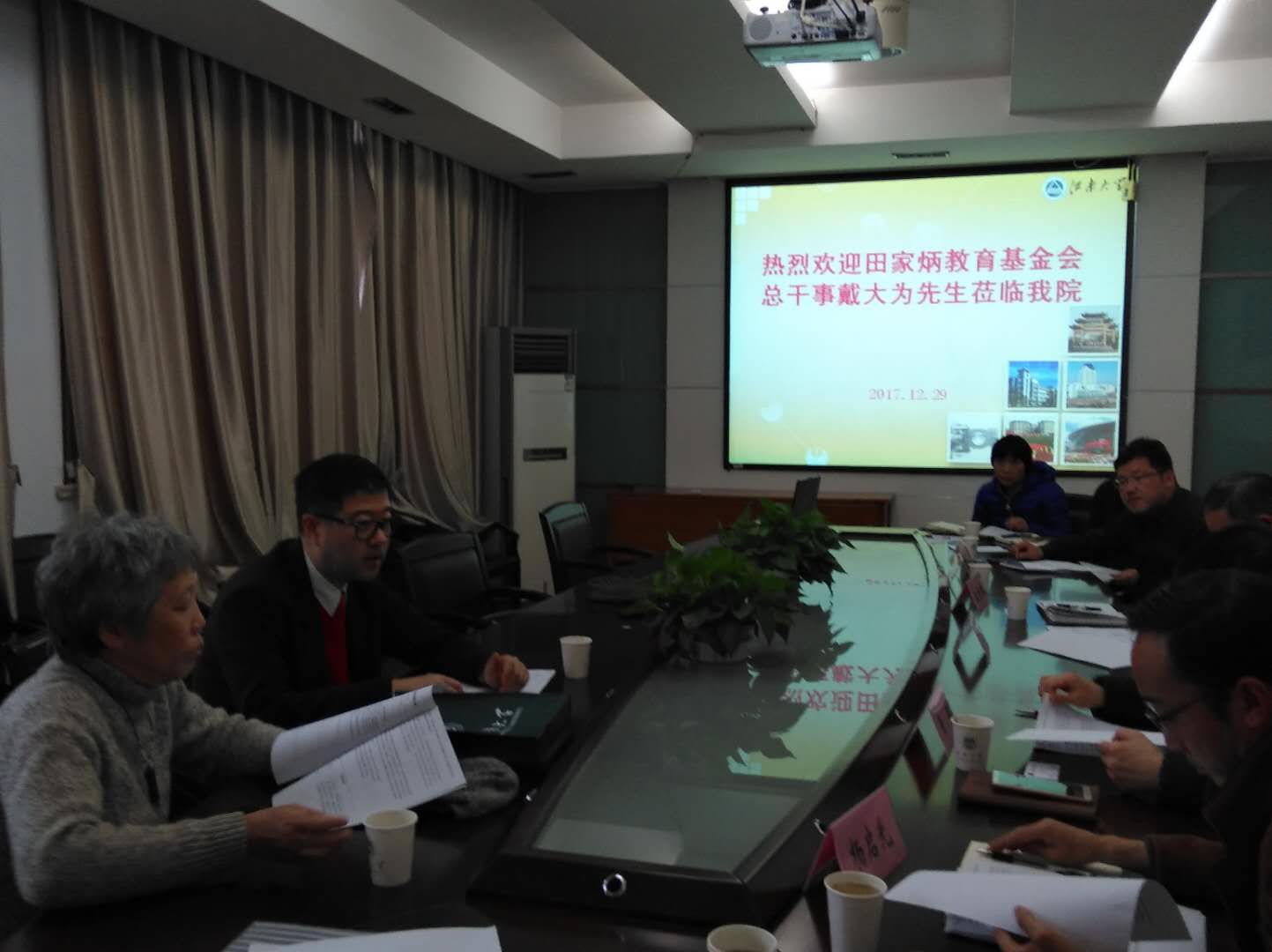 副院长惠恭健、教育系主任杨启光教授分别向戴干事汇报了第九届全国田家炳中学校长论坛准备情况。2018年全国田家炳中学校长论坛将在10月中旬在江南大学举办同时今年也是田家炳博士百岁华诞。希望借此论坛机会集中海峡两岸及港澳台地区教育理论研究与学校领导实践的精英,追念与传承田老“百年树人”文化精神,促进道德教育,弘扬中华文化,融合世界文明,根植学校与课堂,开展基于“新时代教育新设计”的广泛深入对话与研究。