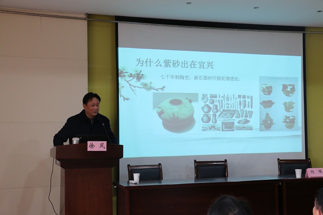 多了一份联系、一份期待一份特殊的情感。接下来,徐风先生作题为“文心与壶韵——漫谈江南文化中的紫砂传奇”的文化讲座。徐教授从紫砂的悠久历史讲到壶与茶的相依相生关系,再到紫砂里的文化底蕴,步步深入、引人入胜。他指出,紫砂壶的气韵能传达出制壶者独一无二的心胸灵魂,是一种文化的共鸣,它作为传统文化精髓传承的一个重要媒介,融陶文化、茶文化、诗文、书画等于一身。此外,徐教授还介绍了供春、陈明远、陈鸿寿、邵大亨、顾景舟等文人,带大家一起见证了紫砂的传奇。