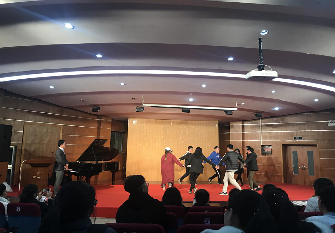 之后,神原雅之教授为了让听众更好的了解达克罗兹教学法,设置了几个小游戏,音乐系学生上台与神原雅之教授进行活动,使现场气氛达到高潮。