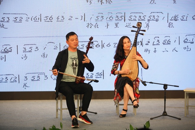 音乐系弹拨乐(琵琶、古筝)专业的同学们更是通过自己的演奏让无锡的音乐文物在舞台上“活”起来:古朴的琵琶曲《陈隋》、无锡音乐家华彦钧留世琵琶曲《大浪淘沙》、当代无锡籍著名作曲家王建民的古筝协奏曲《枫桥夜泊》、琵琶名曲《十面埋伏》等。音乐会还邀请了中国民族歌剧传承发展工程重点扶植剧目、2016江苏省文化厅重点投入剧目——民族歌剧《二泉》中的琵琶演奏尤丹老师,无锡市锡剧院演出团副团长、乐队首席主胡朱小川老师现场演示民族歌剧《二泉》中的琵琶段落和锡剧中的经典音乐片段,两位老师用精彩的演奏和多年的舞台实践经验向大家介绍了戏曲中的江南音乐元素,引起现场强烈共鸣,观众们报以热烈掌声。整场音乐会创意独特、学养丰富,许恩老师声情并茂、诙谐激情的讲解更是吸引了现场每一位观众。音乐会取得了圆满成功,是近年来不可多得的一场学术型音乐会,为江大师生和无锡市民提供了一场视听盛宴。