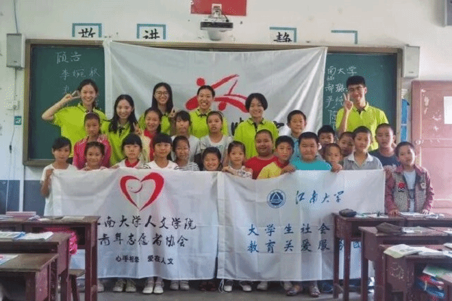 在一切安排妥当之后,江南大学支教团的志愿者们和南京师范大学的同学们,一一向孩子们介绍了自己,并与孩子们进行了互动与交流。