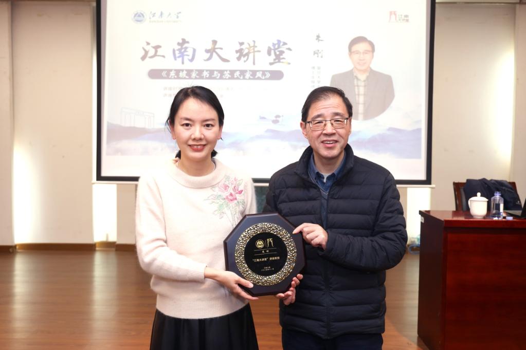2025年11月21日下午,复旦大学朱刚教授的讲座《东坡家书与苏氏家风》在江南大学文浩馆205会议室成功举行。讲座开始前由黄晓丹教授向朱刚教授赠予“江南大讲堂”讲座嘉宾荣誉牌匾。