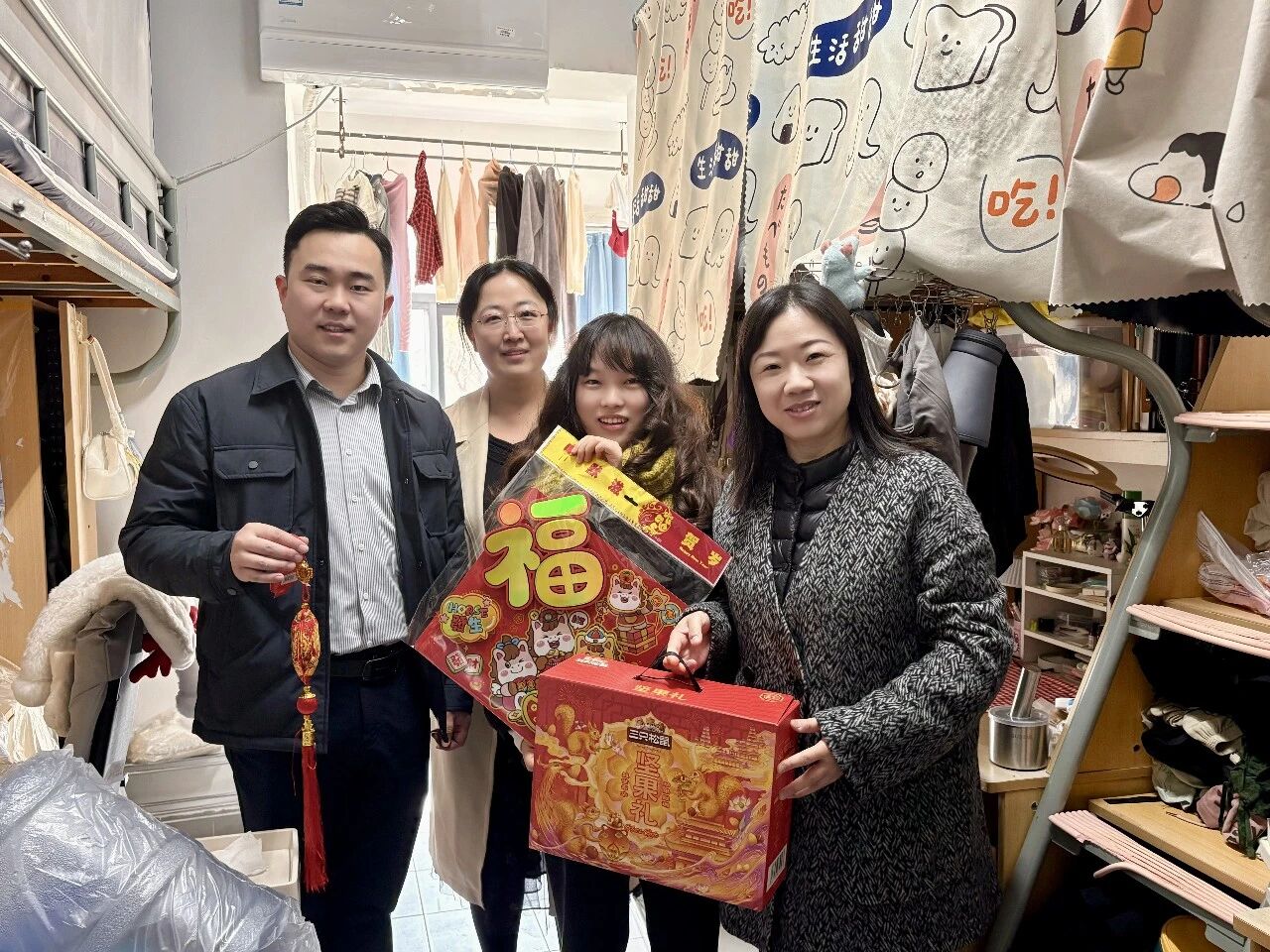 党委书记王晖、辅导员张雅静、邵祥岚、王振彬一行深入学生宿舍,开展新春走访慰问活动,为留校学子送上诚挚的节日祝福与暖心关怀。